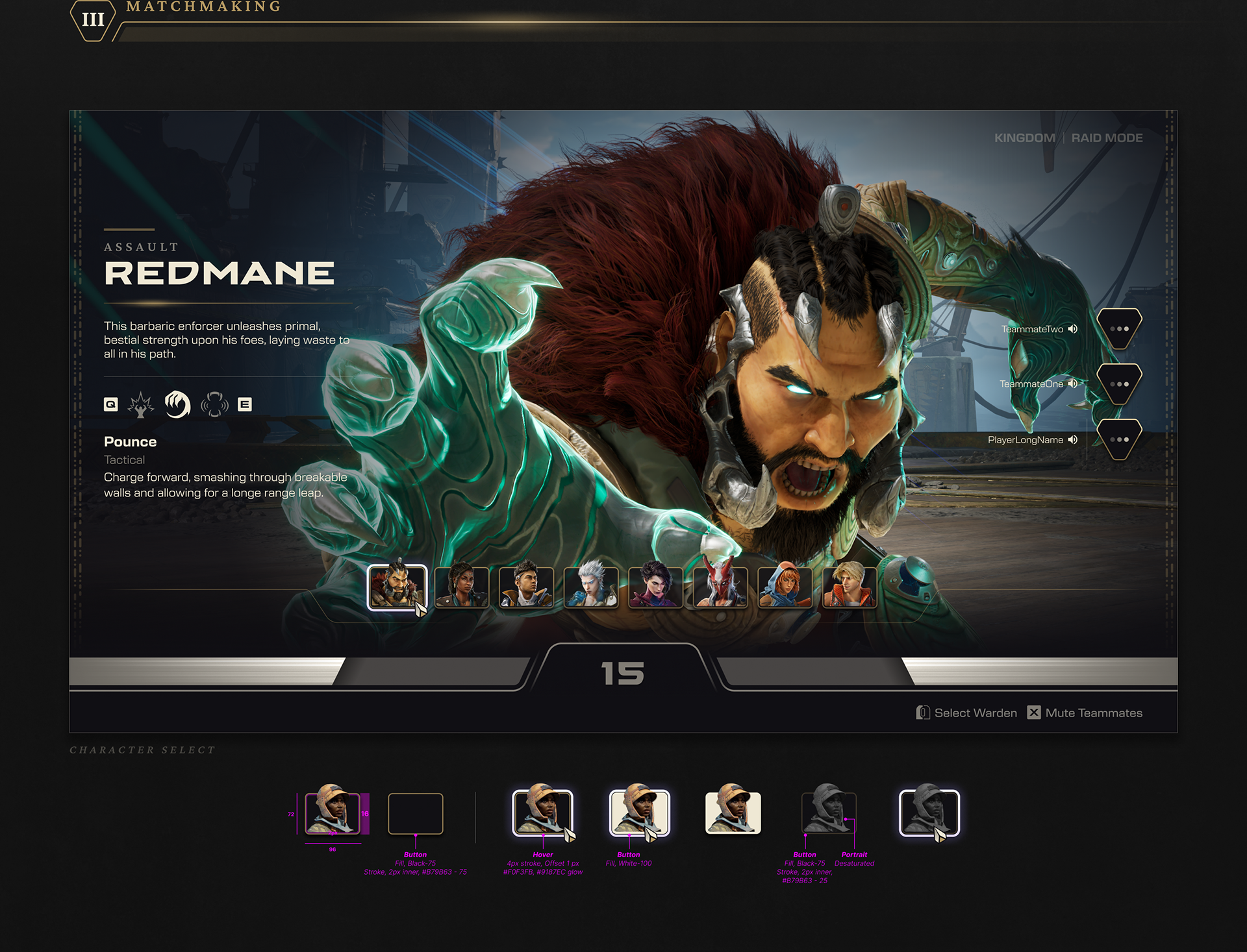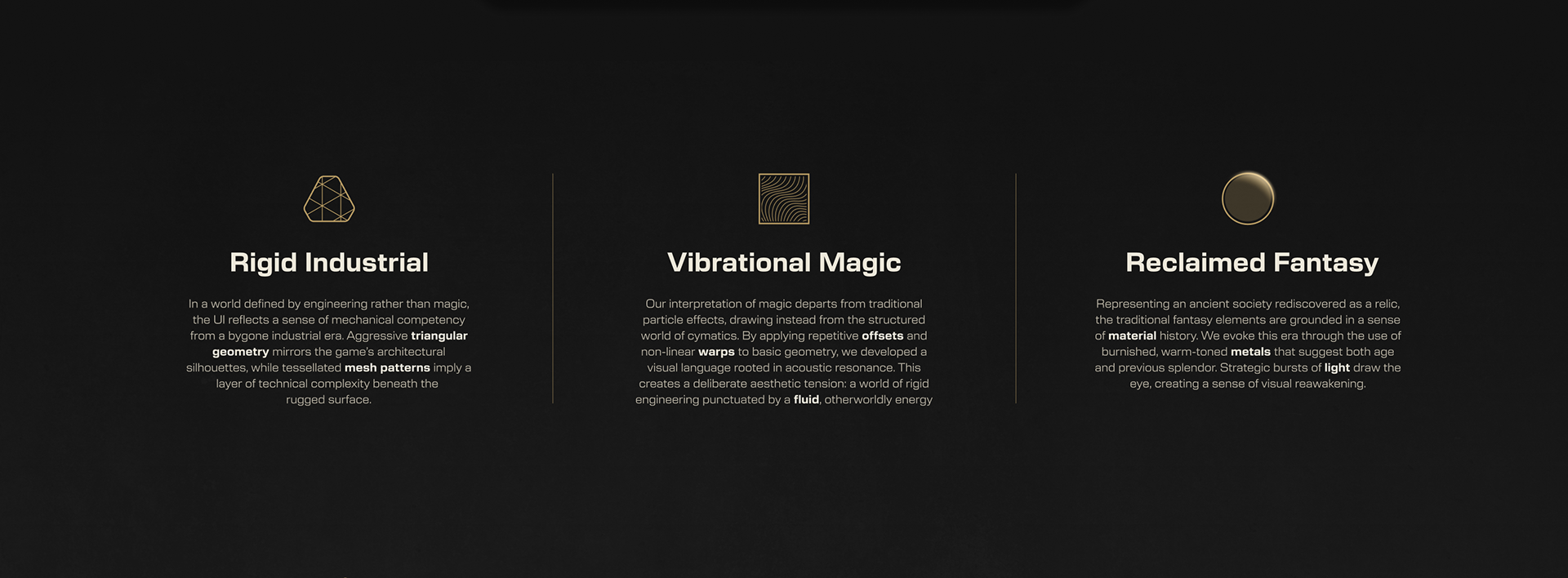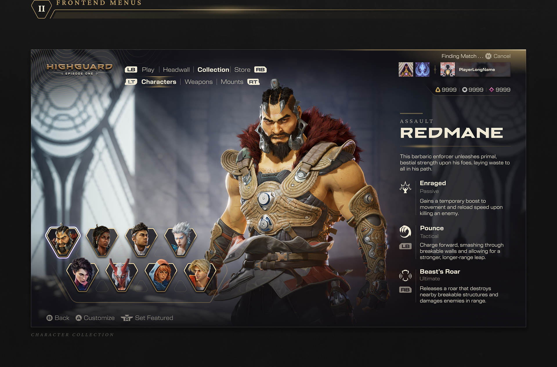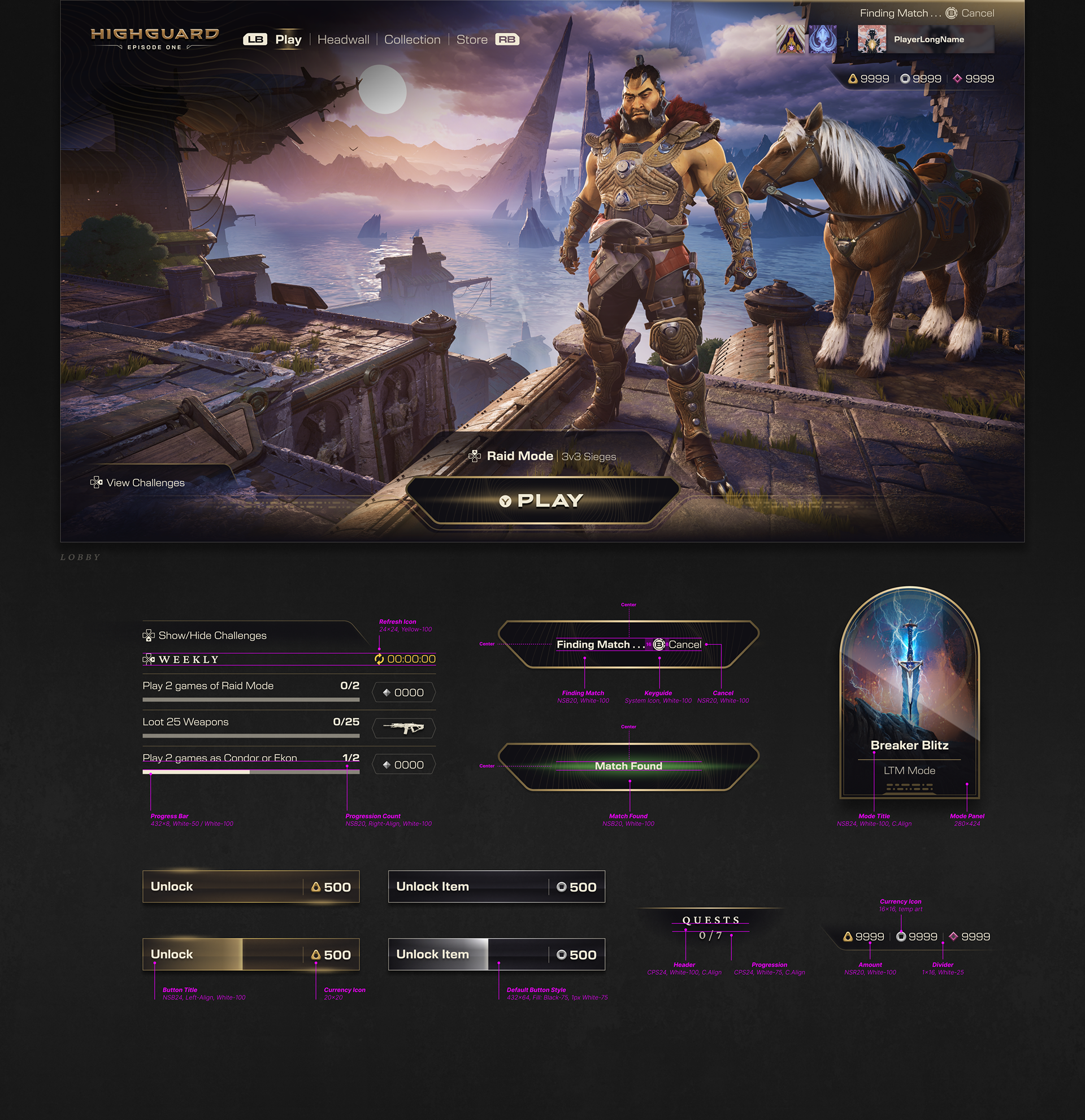 Principal UI Artist, Highguard Wildlight Entertainment Led UI art direction for this fantasy/sci-fi raid shooter from the ground up. Defined the visual language for a new IP, creating design systems that bridged two genres into a cohesive aesthetic, and went on to anchor the product's overall brand identity.